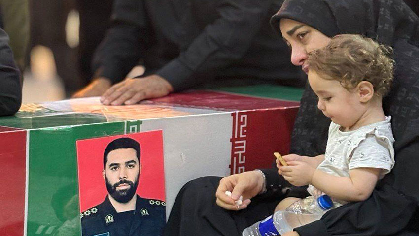 همسر و فرزند شهید در کنار پیکر مطهر